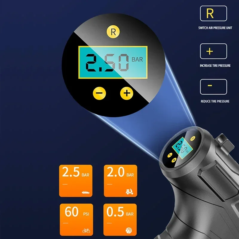 The 120W Portable Air Compressor is a versatile and convenient solution for inflating car tires, bicycle tires, sports balls, and other inflatables. Equipped with a 150PSI maximum pressure, it quickly and efficiently fills tires to the desired pressure. This device supports both wireless and wired operation, providing flexibility for use on the go or at home. The digital display allows precise monitoring of pressure for accurate inflation. Compact and lightweight, it is easy to store in your car or carry on outdoor trips. Ideal for emergencies, it ensures you’re never stranded with low tire pressure. Compatible with cars, bicycles, motorcycles, and various inflatable equipment, it is a multifunctional tool for daily use. Its durable construction ensures long-lasting performance even under frequent use. The air pump is easy to operate with intuitive controls for hassle-free inflation. Perfect for road trips, camping, sports, and home use, it delivers reliable results every time. The portable design allows quick deployment in any situation. Safe and efficient, it prevents overinflation with automatic pressure monitoring. Its ergonomic design reduces fatigue during operation. A must-have for vehicle owners, cyclists, and outdoor enthusiasts, it combines convenience, speed, and accuracy in one compact tool.